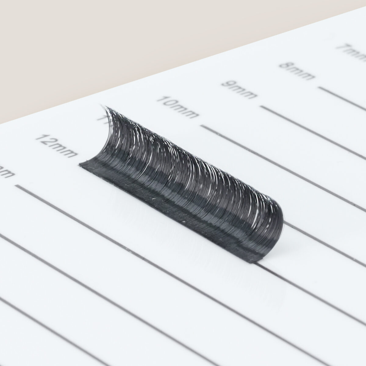 A colocação em cascata das pestanas na fita permite uma fixação correta e rápida nas pinças (adequado para iniciantes em técnicas de volume). Ao puxá-los com a pinça, o leque vem praticamente pronto.